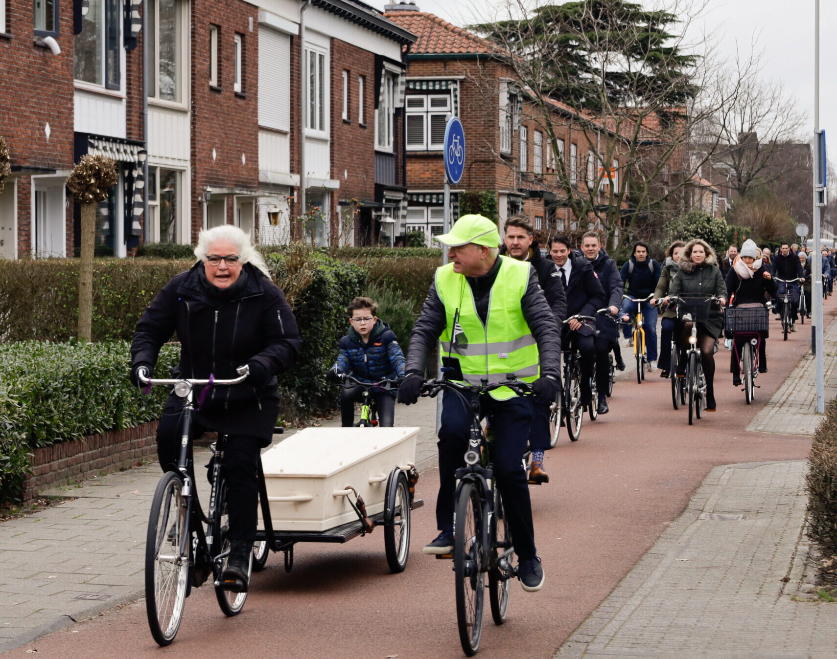 Caroline: “Ja, het is apart, op de fiets, maar het voelde zó goed. Zeker met zoveel mensen erbij. Je staat veel dichter bij elkaar dan als ieder apart in een auto zit. En dit is veel milieuvriendelijker dan mensen die in een hoop auto’s naar een afscheid rijden.”
